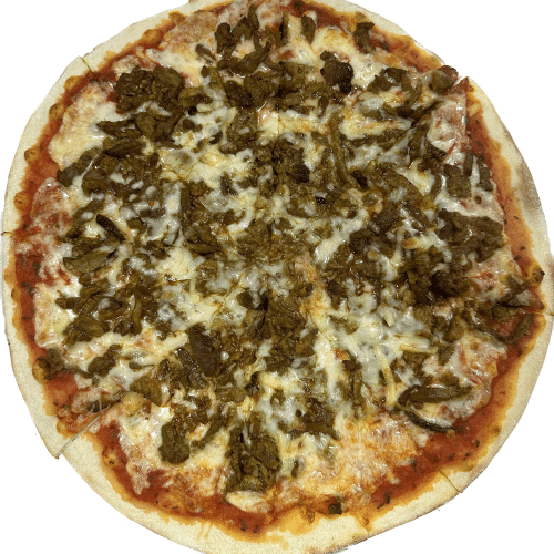 Tomatensaus, mozzarella kaas, kalkoen ham, salami, champignons en olijven